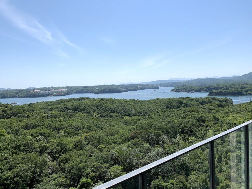 真珠の養殖で知られる日本有数のリアス式海岸、英虞湾を一望できます。