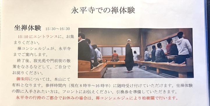 →宿にチェックイン→永平寺で座禅体験→夕食