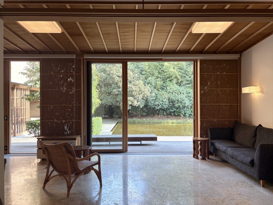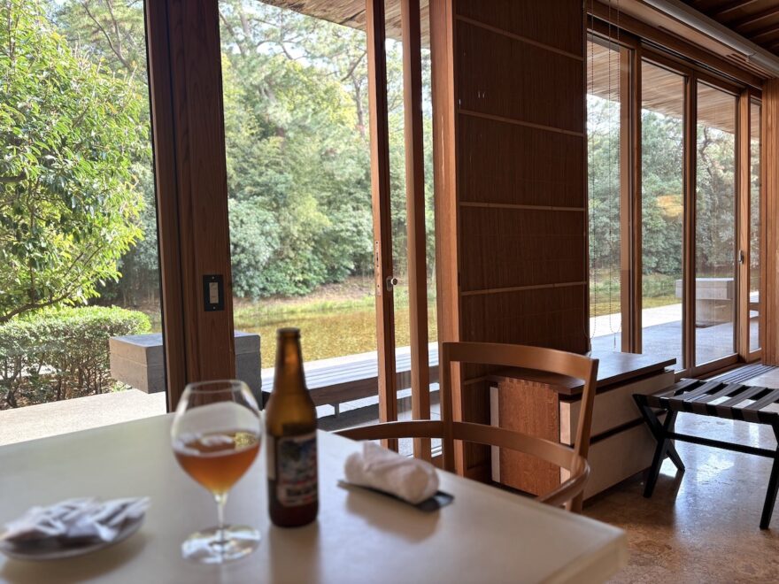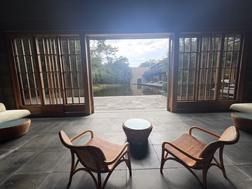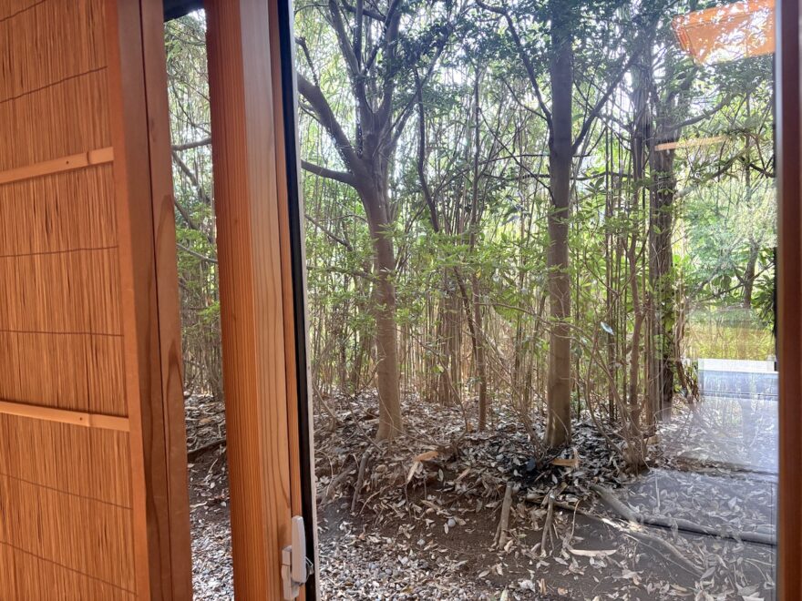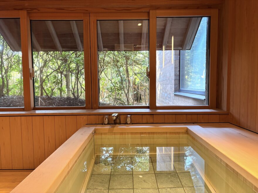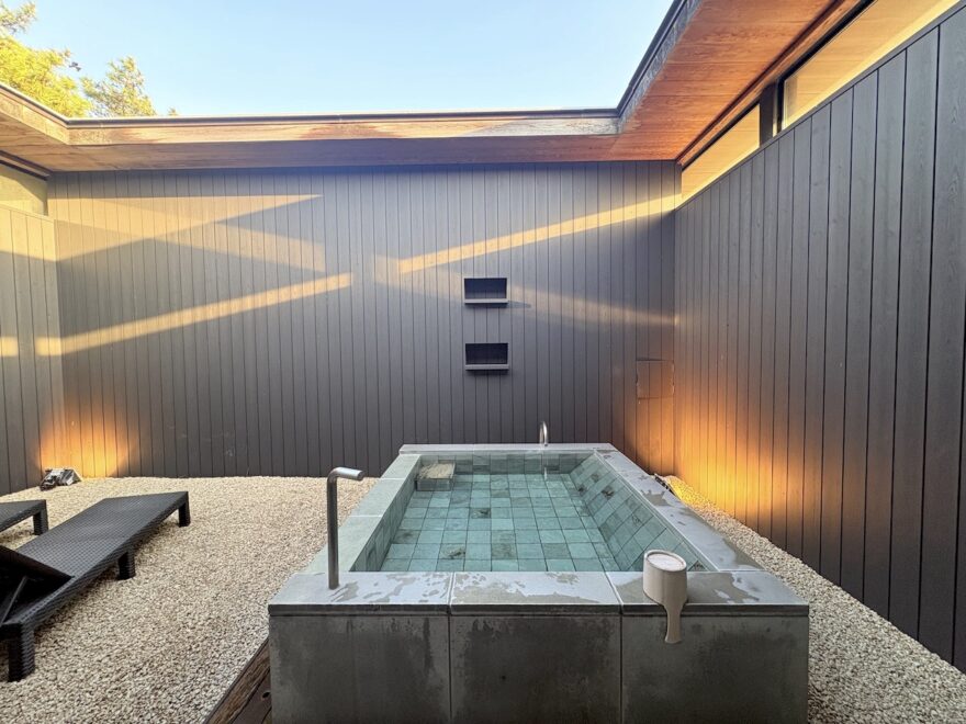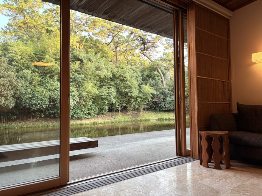 風呂上がりは水盤と緑を眺めながらリラックス。