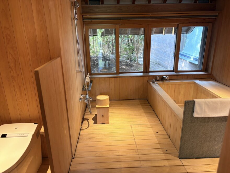 松林の景色を一望できるバルコニーには専用の露天風呂、室内にはシャワーブース。