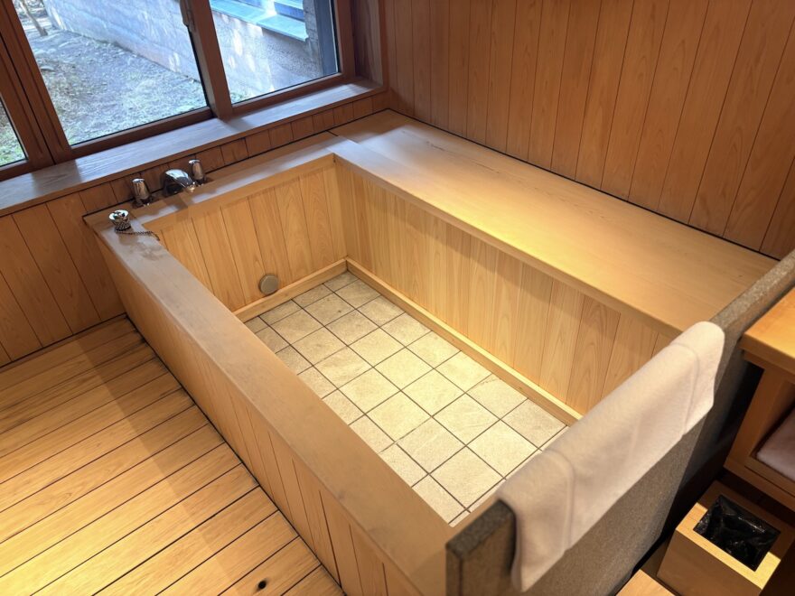 松林を一望できる広々としたバルコニーの一角に露天風呂あり。