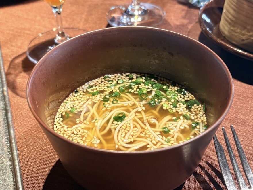 締めの「ターサイと黄ニラの上湯麺」は黄ニラが入らなかったらしく、