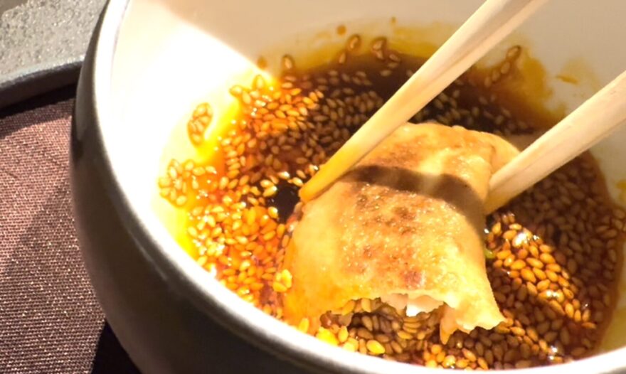 そして、残った黒酢と自家製のラー油で作ったたれに、餃子をつけて食べ、