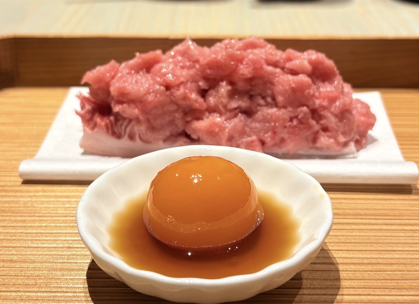 卵黄の醤油漬け、べっこう玉がまさに月のようで、本当に見事な「月と鮪」です。